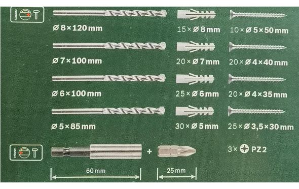 | 75 βίδες : 25τεμ. 3.5 x 30, 20τεμ. 4.0 x 35, 20τεμ. 4.0 x 40, 10τεμ. 5.0 x 50. |