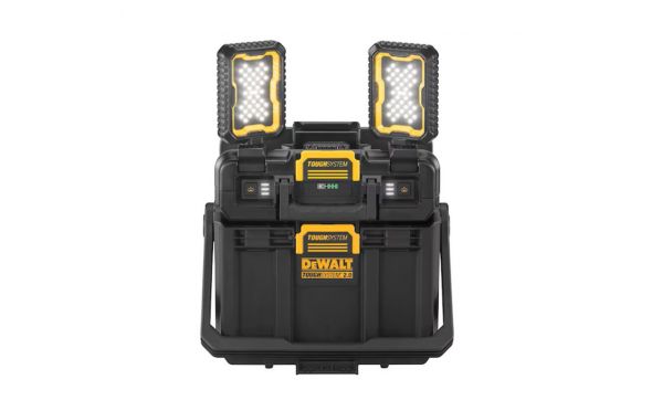 - Τροφοδοτούμενο από μπαταρίες 18V XR, το φως μπορεί να λειτουργήσει από το πάτωμα, πάνω από έναν πύργο κουτιού ToughSystem ή από ένα τρίποδο φωτισμού.