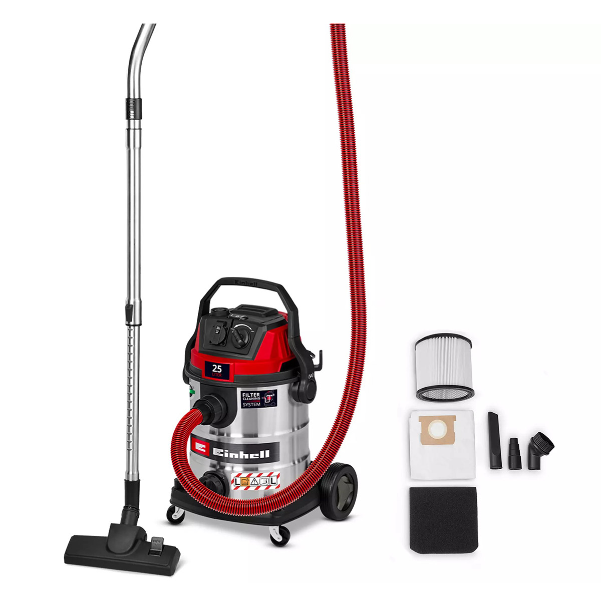 Για ρύπους (AGW>1 mg/m³) & κλάση σκόνης L με βάση τα πρότυπα ΕΕ.Φιλτράρισμα βλαβερών ρύπων όπως σοβάς.Με σύστημα καθαρισμού φίλτρου για την αποκατάσταση της ισχύος.Ρυθμιζόμενη ισχύς αναρρόφησης με έλεγχο ταχύτητας.Στιβαρός κάδος 25l από ανοξείδωτο ατσάλι.Λειτουργία φυσήματος για τον καθαρισμό δυσπρόσιτων σημείων. Μεγάλες ρόδες για μεγαλύτερη ευελιξία.Πρακτική βάση αξεσουάρ για εύκολη αποθήκευση.Βίδα για την αποστράγγιση του νερού.Τηλεσκοπικός σωλήνας από ανοξείδωτο ατσάλι (Ø 36 mm) με ρυθμιστή.Πλαστικός σωλήνας αναρρόφησης 3 μέτρων βαρέως τύπου (Ø 36 mm).