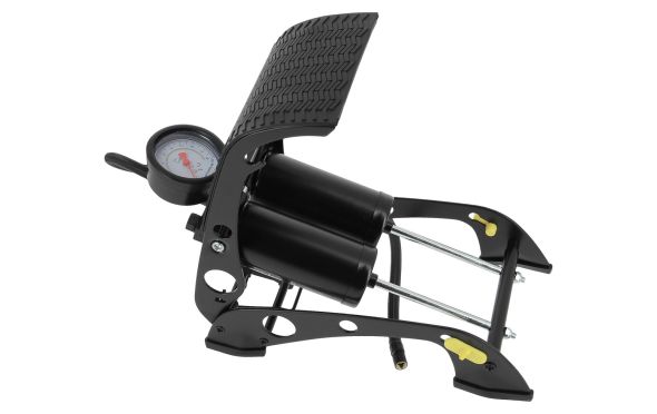 Τρόμπα ποδιού με πιστοποιημένο μανόμετρο για ακριβή ρύθμιση της πίεσης στα λάστιχα. Μέγιστη πίεση 7 bars. Με διπλό έμβολο για υψηλές επιδόσεις και σωλήνα 80 εκατοστών για όλους τους τύπους ελαστικών έως και 19"". Μπρούτζινη βαλβίδα που βιδώνεται εύκολα στη βαλβίδα του ελαστικού για καλύτερο και ακριβέστερο φούσκωμα. Πλαστική βάση για καλύτερη σταθερότητα.