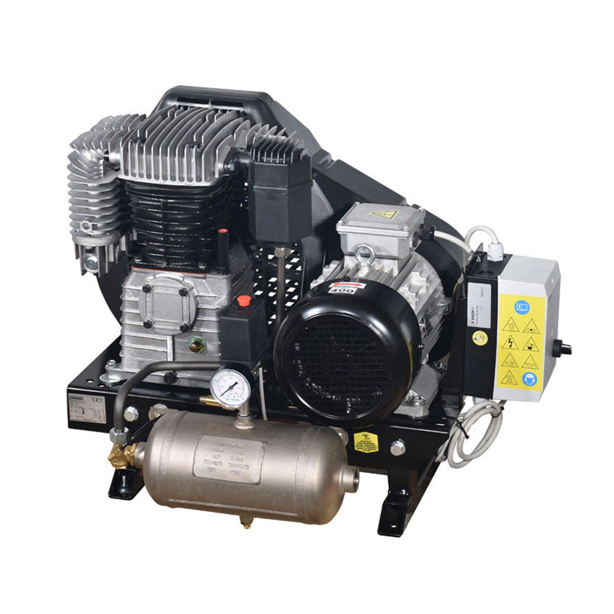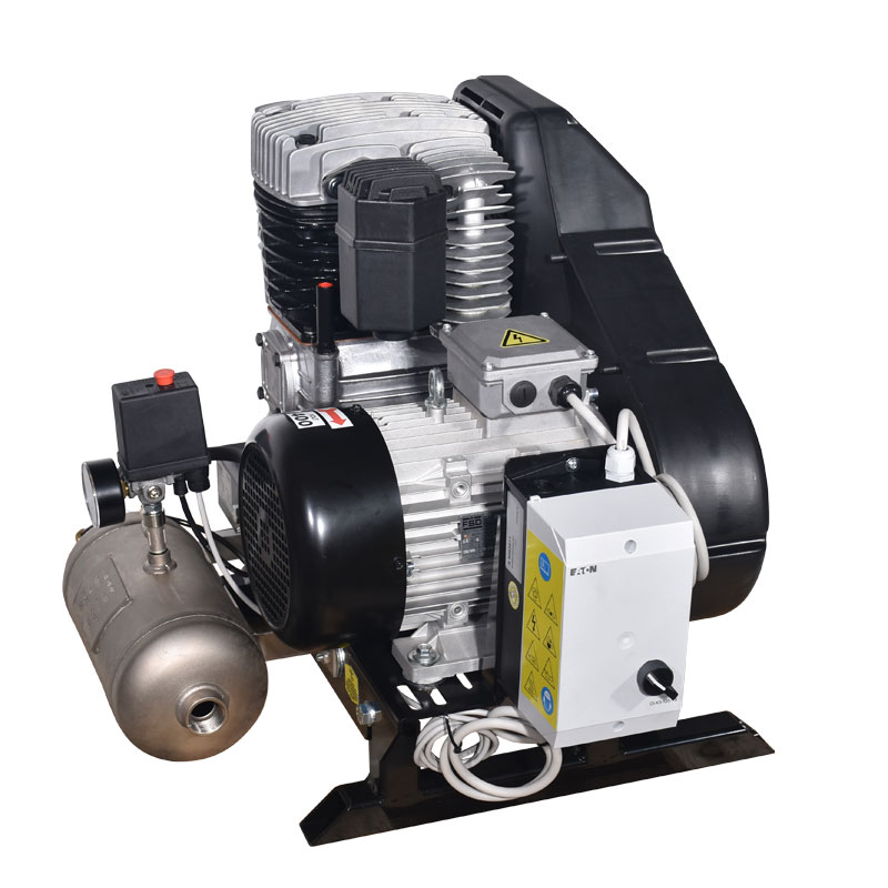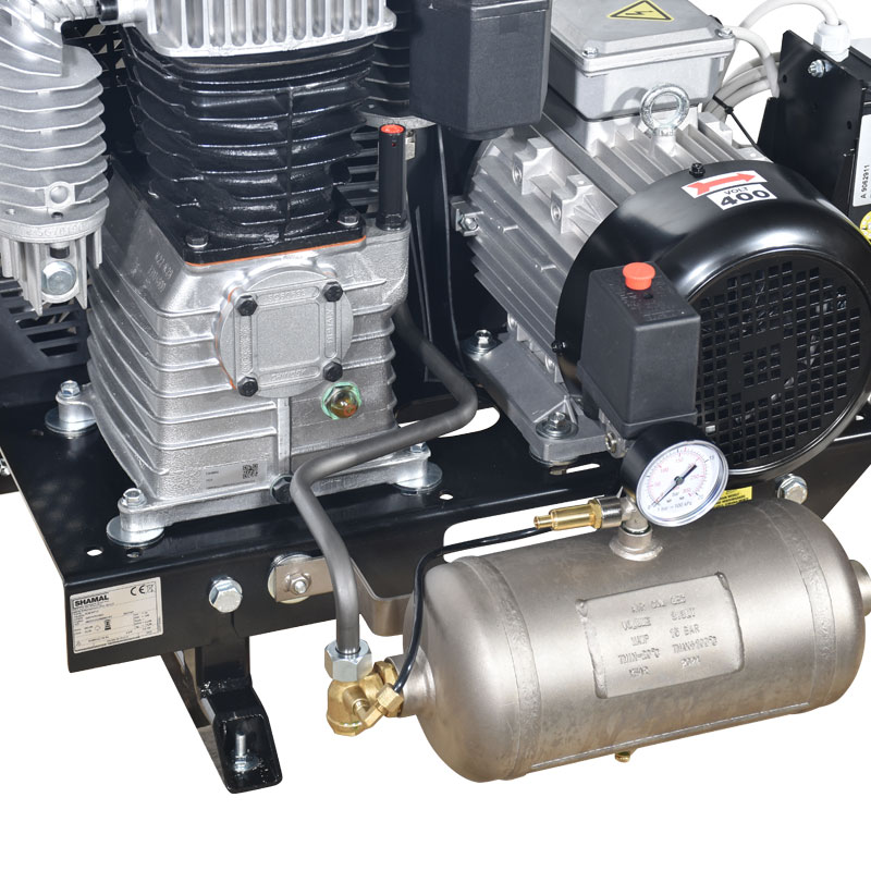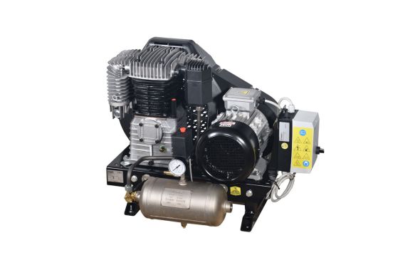 Αεροσυμπιεστής σε Βάση με Ιμάντα, με Δικύλινδρη Μαντεμένια Ελαιολίπαντη Κεφαλή , Λειτουργεί σε Χαμηλές Στροφές 1290 rpm για να Ψύχεται Καλύτερα και να έχει Λιγότερες Φθορές. Κατάλληλος για Χρήση σε Επαγγελματικές Εφαρμογές.Οι αεροσυμπιεστές σε βάση χρησιμοποιούνται στις περιπτώσεις που υπάρχει πρόβλημα χώρου στα δίκτυα πεπιεσμένου αέρα.Το αεροφυλάκιο μπορεί να τοποθετηθεί σε ξεχωριστό χώρο, ενώ στις ενδιάμεσες θέσεις μεταξύ του αεροσυμπιεστή και των λήψεων του αέρα είναι εύκολο να τοποθετηθούν μηχανήματα και φίλτρα για την βελτίωση της ποιότητας του πεπιεσμένου αέρα.Ο αέροσυμπιεστής διαθέτει κεντρικό διακόπτη τροφοδοσίας ,ρυθμιζόμενο θερμικό προστασίας του μοτέρ (προρυθμιζμένο στα 10 Α) και καλώδιο τροφοδοσίας 4x2,5 mm² - 1,2...