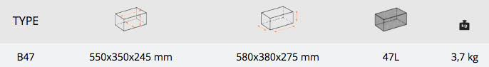 Alpos - B47 Κουτί Αποθήκευσης Αλουμινίου 47Lt Είναι κατάλληλα για όλα τα είδη μεταφοράς και αποθήκευσης. Ανθεκτικά στη διάβρωση, καιρικές συνθήκες και μεγάλες θερμοκρασίες. Προστασία από εξωτερικές επιρροές όπως σκόνη και νερό. Δύο κλειδαριές.