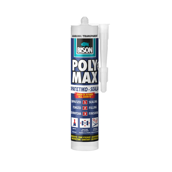 - Το BISON Poly Max® Sealant είναι ένα υψηλής ποιότητας, μόνιμα ελαστικό, βαφόμενο και ανθεκτικό στη μούχλα σφραγιστικό "όλα σε ένα" (μπορεί να αντικαταστήσει τα ακρυλικά, σιλικονούχα και PU σφραγιστικά) για αδιάβροχη σφράγιση αρμών και ραφών, γέμισμα οπών και ρωγμών χωρίς συρρίκνωση και φινίρισμα εργασιών σφράγισης με αισθητικό τρόπο.