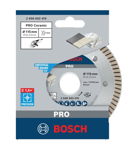 Κατά την κοπή πλακιδίων, η ποιότητα είναι το παν: ένας καλός, εξειδικευμένος διαμαντόδισκος, όπως ο PRO Ceramic, έχει σχεδιαστεί για να προσφέρει στους επαγγελματίες καλή κοπή με ελάχιστα σπασίματα - εξασφαλίζοντας λιγότερα απόβλητα και εξαιρετικά αποτελέσματα εργασίας.Κοπή ακριβείας πλακιδίωνΚόκκος διαμαντιού υψηλής ποιότητας και διαμαντένια μήτρα για ανθεκτικότητα και ακρίβεια.Χείλος βαρέος τύπου για φινίρισμα υψηλών προδιαγραφών και ομαλή πρόοδο κοπήςΜε εσωτερική διάμετρο 22,23 mm για γωνιακούς λειαντήρες τυπικού παξιμαδιού κλειδώματος