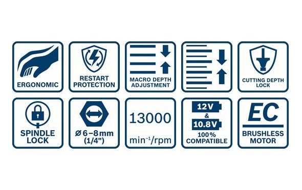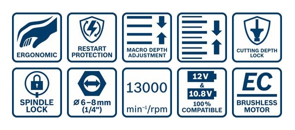 Η πρώτη στον κόσμο επαγγελματική φρέζα ακμών μπαταρίας – νέο σχήμα για τέλειο έλεγχο και εύκολο χειρισμό με το ένα χέρι. Εργονομία: Άνετος χειρισμός χάρη σε ένα μοναδικό σχεδιασμό, στο μικρό βάρος και στο ιδανικό σημείο εξισορρόπησης. Συμπαγής: Χάρη στο συνδυασμό ενός κινητήρα χωρίς ψήκτρες EC και του συστήματος 12 V. Αυτονομία χωρίς καλώδιο: Η πρώτη επαγγελματική φρέζα ακμών μπαταρίας καθιστά δυνατή εργασία χωρίς προβλήματα. Drop control για μέγιστη ασφάλεια ακόμη και σε περίπτωση τυχαίας πτώσης. Εύκολο κλείδωμα για γρήγορη αλλαγή της φρέζας. Ρύθμιση βάθους κοπής για κάθε τύπο εφαρμογής. Πλάκα βάσης με βελτιστοποιημένο υλικό για ακριβή οδήγηση κατά τη διάρκεια της εργασίας.
