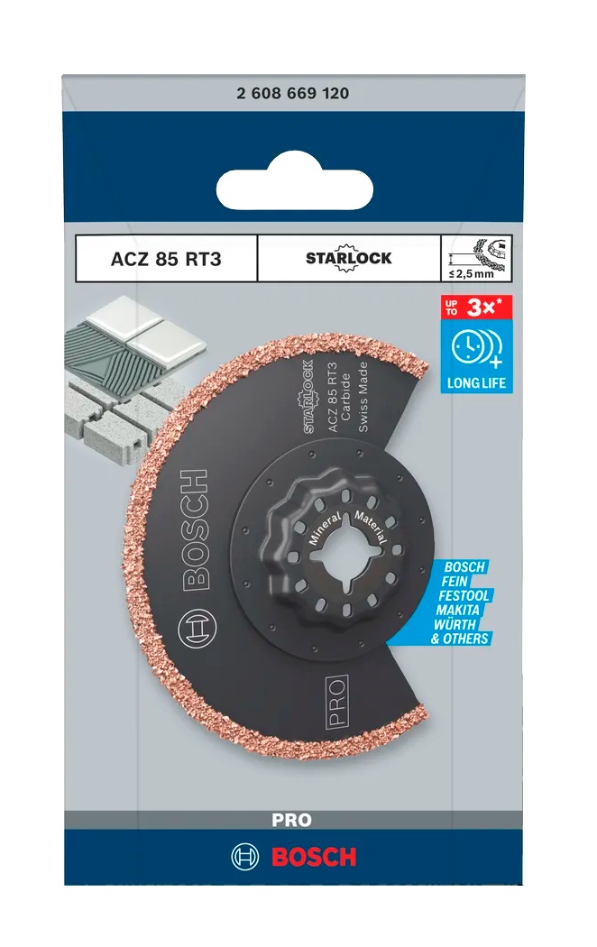 Τα πολυεργαλεία είναι ιδανικά για την αφαίρεση του παλιού αρμόστοκου χωρίς να καταστρέφουν τα πλακάκια γύρω από αυτό. Η PRO ACZ 85 RT3 το κάνει αυτό αποτελεσματικά και προσφέρει μεγάλη διάρκεια ζωής του προϊόντος. Μπορείτε επίσης να τη χρησιμοποιήσετε για να κόψετε κανάλια καλωδίων σε πορομπετόν.Η λάμα PRO ACZ 85 RT3 Grout Segment χρησιμοποιεί σκληρό κόκκο καρβιδίου για να είναι ανθεκτική και αποτελεσματική όταν εργάζεστε σε λειαντικά υλικά.Τραχύς, αποτελεσματικός κόκκος καρβιδίου.