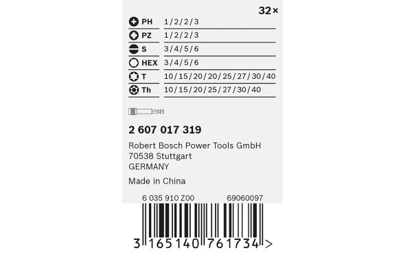 | Περιεχόμενο σετ: PH1 / PH2 / PH3 / PZ1 / PZ2 / PZ3 / HEX3 / HEX4 / HEX5 / HEX6 / T10 / T15 / T20 / T25 / T27 / T30 / T40 / SL3 / SL4 / SL5 / SL6 / TH10 / TH15 / TH20 / TH25 / TH27 / TH30 / TH40 / Στήριγμα γενικής χρήσης Quick Release |
