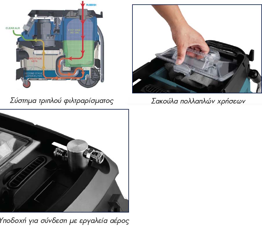 - Σύστημα τριπλού φιλτραρίσματος - Σακούλα (πρώτο στάδιο), Φιλτράρισμα με νερό (δεύτερο στάδιο), Φίλτρο HEPA (Τρίτο στάδιο).