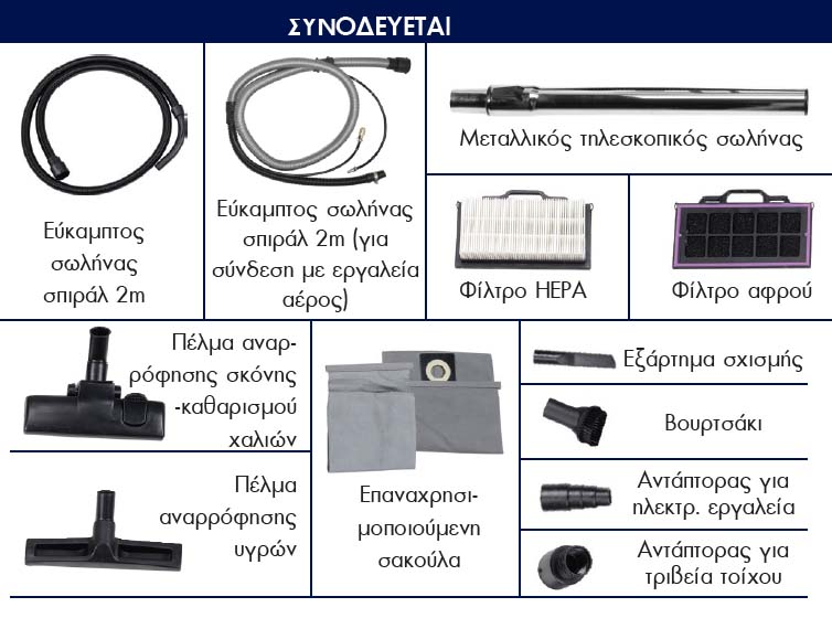 - Κατάλληλη και για ψιλή σκόνη όπως αναρρόφηση σκόνης από τριβεία τοίχου & τριβεία φανοποιίας.