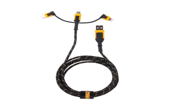 - Το Dewalt 1311356DWG καλώδιο είναι ένα εξαιρετικά ανθεκτικό καλώδιο φόρτισης “3-σε-1” μήκους 1.8m, που καλύπτει τις υποδοχές USB-A → USB-C, Lightning και Micro-USB.