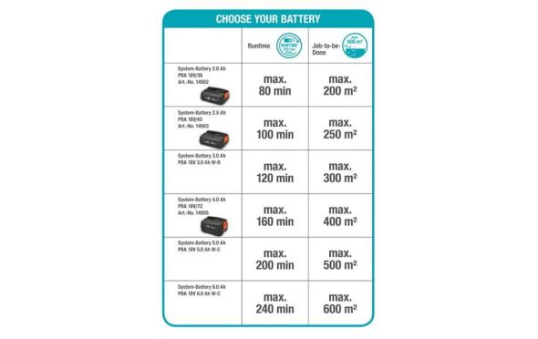 • Με την μπαταρία που περιλαμβάνεται, ο χρόνος λειτουργίας είναι έως 100 λεπτά ή κόβει 250 τετραγωνικά μέτρα.