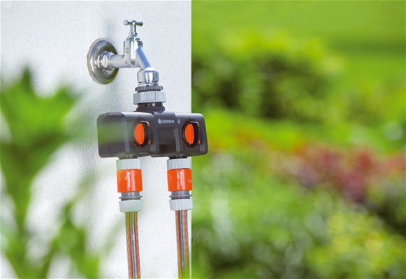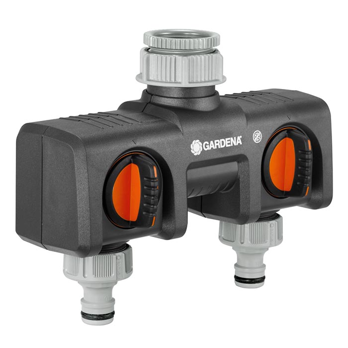 - Με τη διπλή παροχή της GARDENA είναι εφικτή η ταυτόχρονη σύνδεση δύο ποτιστικών συσκευών σε μία βρύση. Οι έξοδοι είναι πλήρως ρυθμιζόμενες. Μπορείτε να συνδέσετε σε αυτές δύο προγραμματιστές αυτόματου ποτίσματος GARDENA.