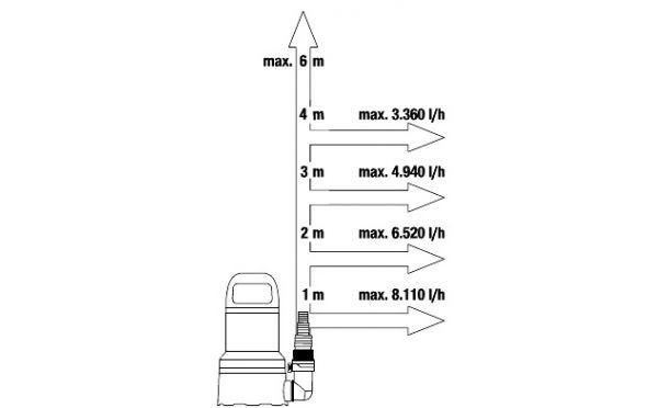 - Με μέγιστη πίεση 0,6 bar και βάθος βύθισης 6 m, μπορούν να αντληθούν έως και 9000 λίτρα νερού ανά ώρα.