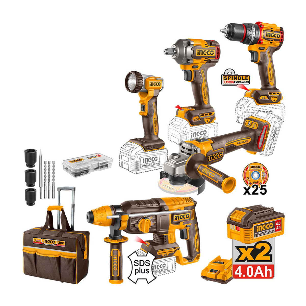 Ingco - CKLI2059E Σετ Κρουστικό Δραπανοκατσάβιδο Μπουλονόκλειδο Πιστολέτο Γωνιακός Τροχός & Φακός Μπαταρίας 20V Li-Ion με Εξαρτήματα & Τροχήλατη Εργαλειοθήκη (2x4.0Ah)