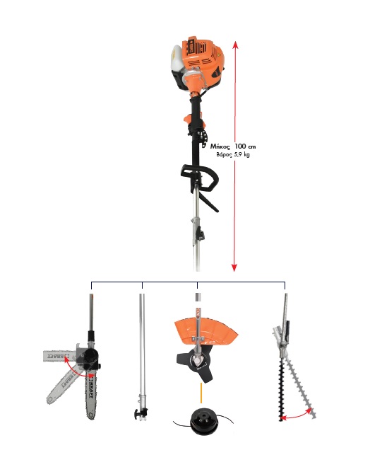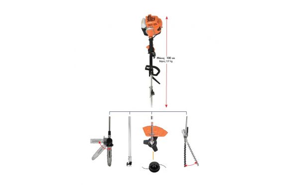 • Μπορεί να δεχτεί 4 διαφορετικά εξαρτήματα: θαμνοκοπτικό, κονταροπρίονο, ψαλίδι μπορντούρας και προέκταση.