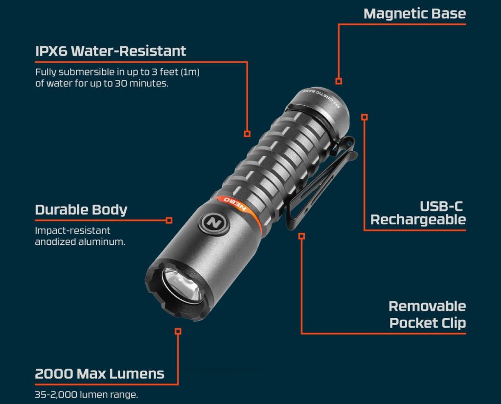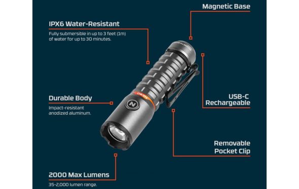 - Ο φακός Torchy 2K της ΝΕΒΟ είναι επαναφορτιζόμενος με USB-C, ανθεκτικός στο νερό (IPX6) και εξοπλισμένος με 5 επιλογές φωτισμού, οι οποίες εναλλάσσονται απρόσκοπτα με την τεχνολογία Smart Power Control.