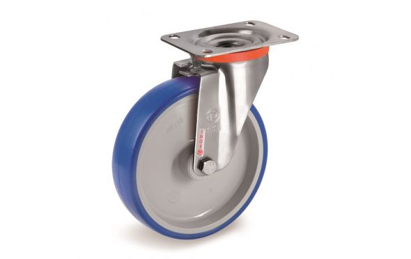 Κατάλληλο για καρότσια και τα μηχανήματα με τα φορτία μεσαίου βαθμου, Κατάλληλο για εσωτερική και εξωτερική χρήση για συχνό πλύσιμο και αποστείρωση.Εξαιρετική αντίσταση κύλισης.Παραδείγματα συνιστώμενες εφαρμογές: καρότσια για βιομηχανική χρήση σε εσωτερικούς χώρους, σωληνοειδή καρότσια, καρότσια για τη βιομηχανία τροφίμων και χημικών.ΡΟΔΑ:Θερμοπλαστική πολυουρεθάνη.ΠΕΛΜΑ:INOX