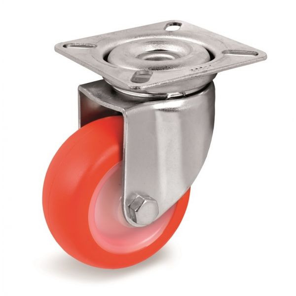 Κατάλληλο για χρήση σε διαφορετικούς τύπους καροτσιών, ιδίως στο χώρο της εστίασης.Καλή ικανότητα μεταφοράς φορτίου σε σχέση με τροχούς μικρής διαμέτρου.Πέλμα:θερμοπλαστική πολυουρεθάνη.Κέντρο: πολυαμίδιο.Βάση: γαλβανιζέ.