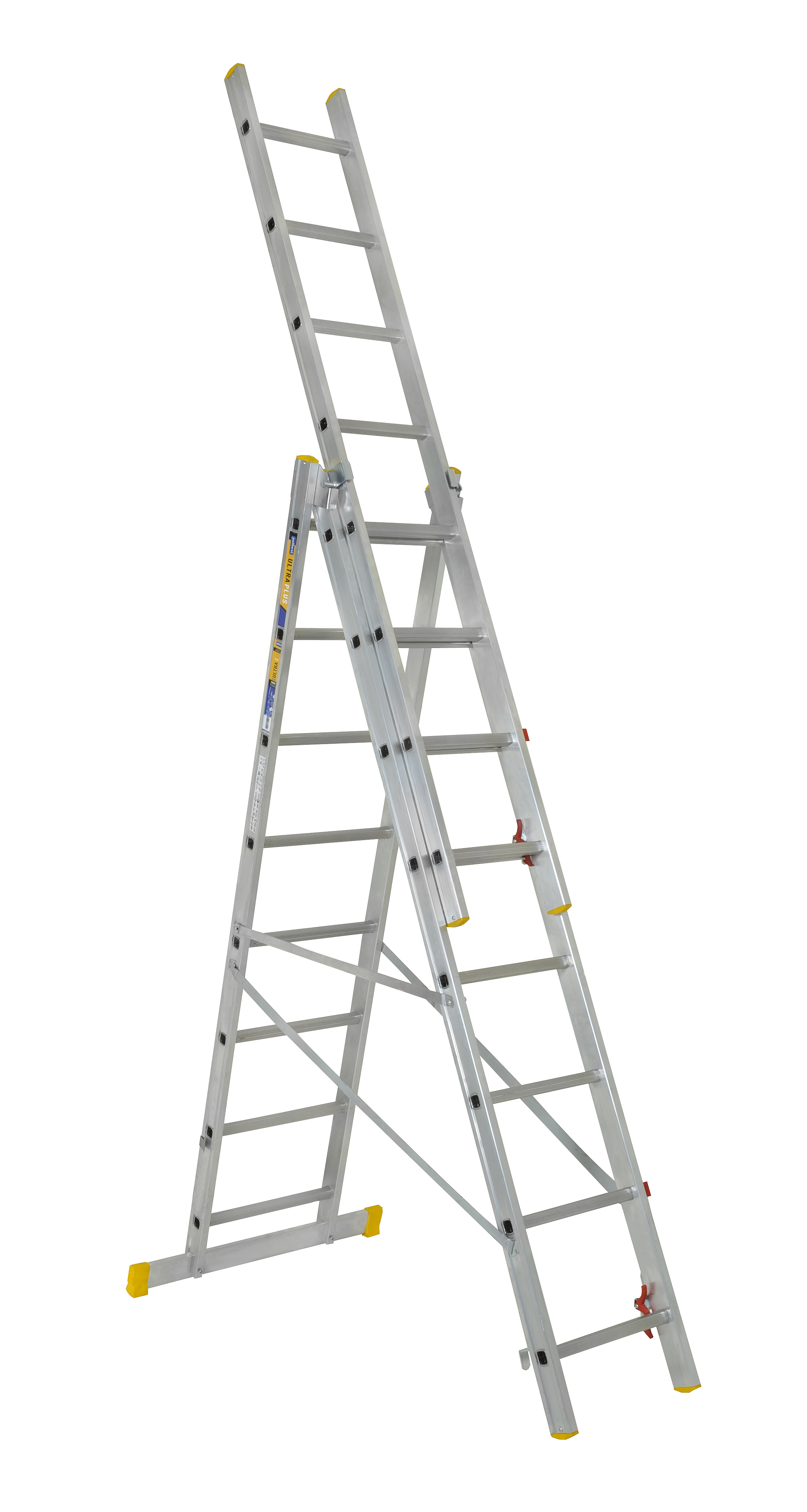ULTRA PLUS - Σκάλα Τριπλού Συνδιασμού 3 Τεμαχίων (3x10). Ενισχυμένος αυτόματος μηχανισμός ασφαλείας στο κλείδωμα της σκάλας. Με εξάρτημα ασφαλείας που εξασφαλίζει ομαλή  επέκταση της σκάλας. Με ιμάντες μέγιστης αντοχής σε υπεριώδη ακτινοβολία και αντηρίδα για επιπλέον ασφάλεια. Τραβέρσα με πέλματα αντιολησθητικά ECO. Η σκάλα παρέχει όλες τις ευρωπαικές προδιαγραφές EN131. Μέγιστη αντοχή 150Kg.
