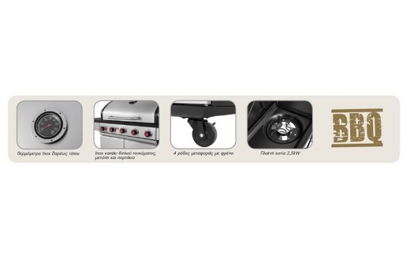 Με 4 καυστήρες από ανοξείδωτο χάλυβα (inox) 3 kW ο καθένας και 1 πλαϊνή εστία 2.5 kW