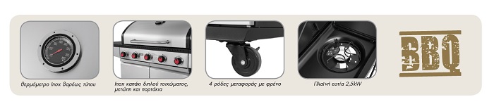 Με 5 καυστήρες από ανοξείδωτο χάλυβα (inox) 3 kW ο καθένας και 1 πλαϊνή εστία 2.5 kW